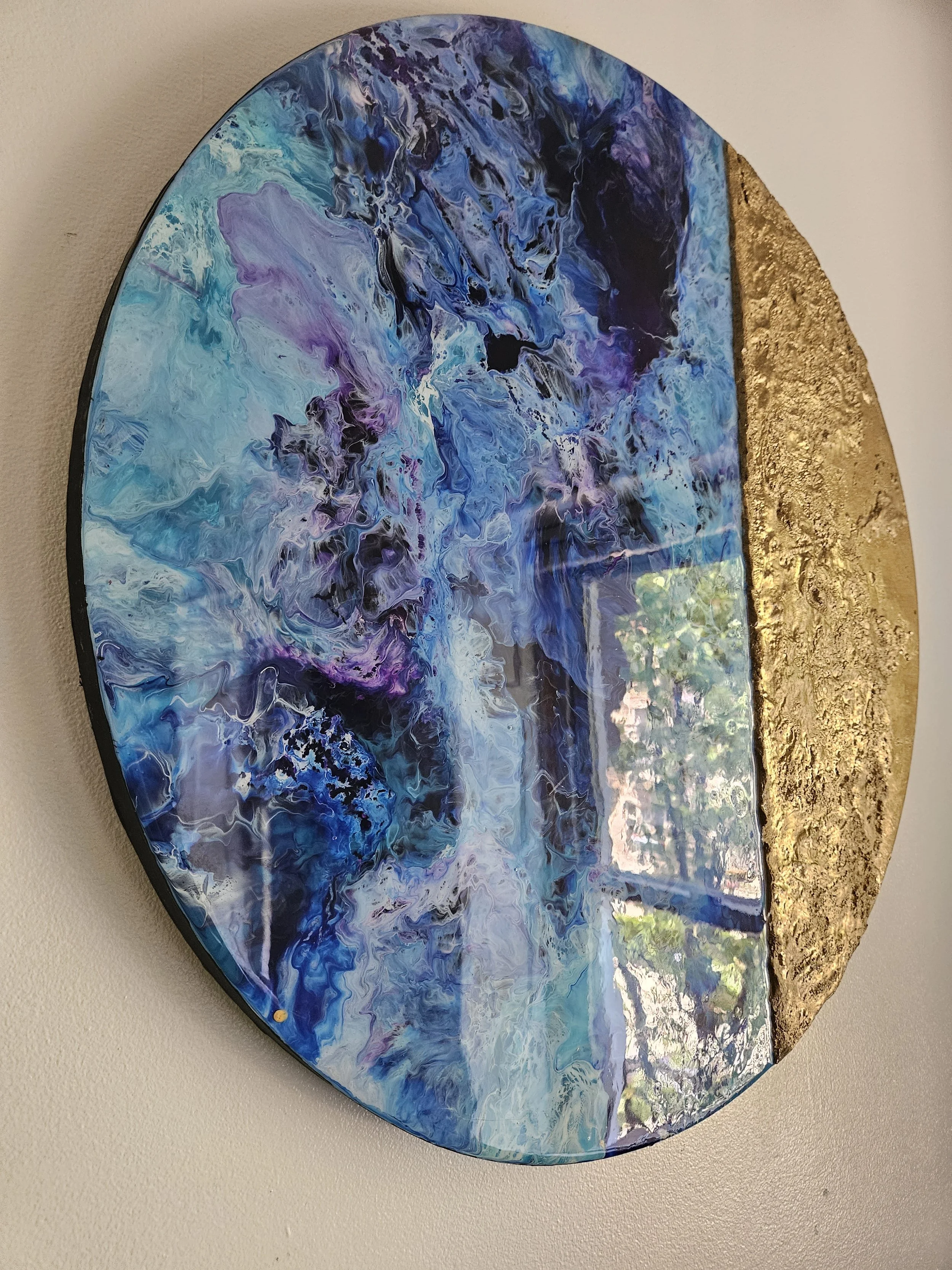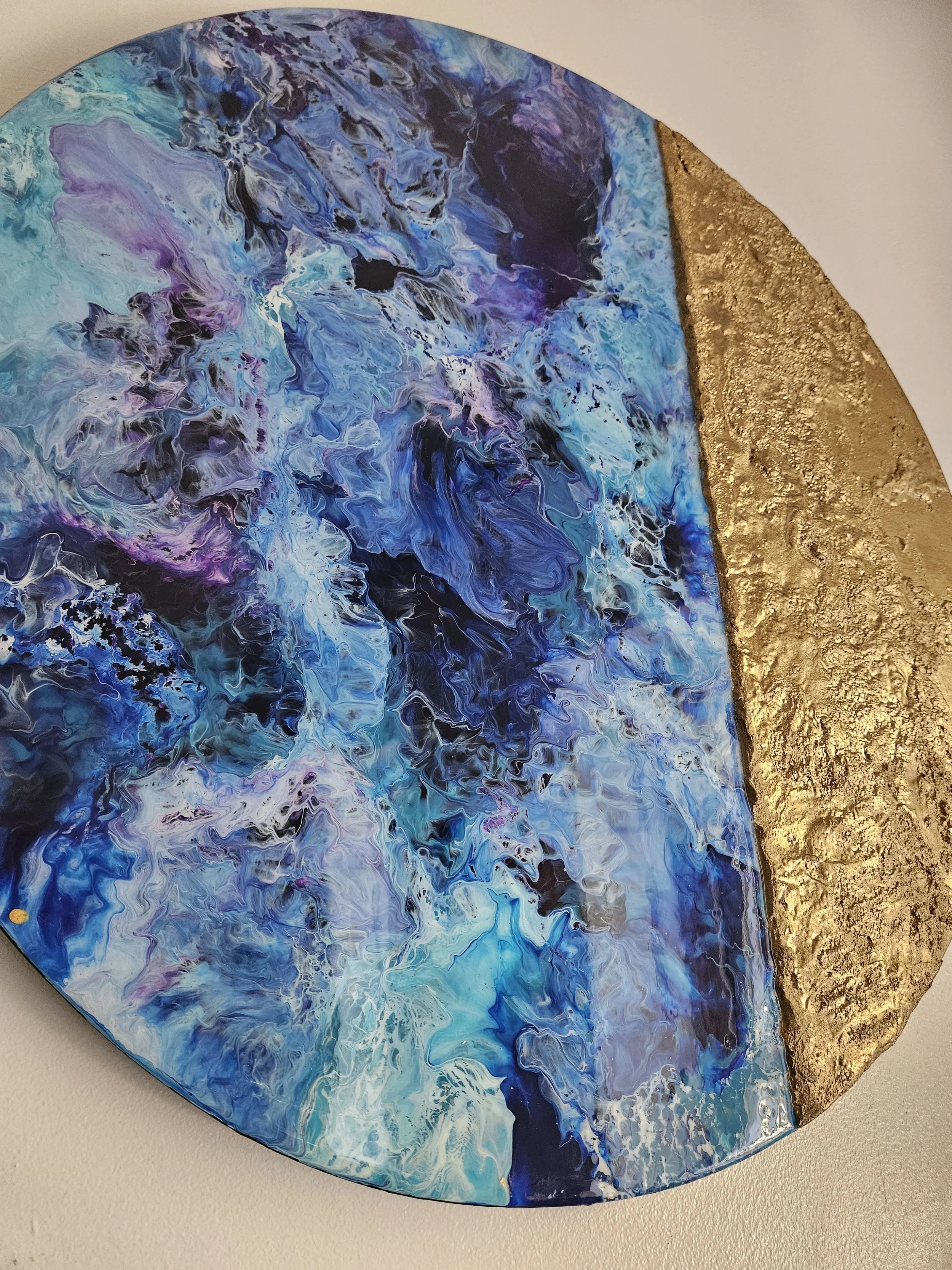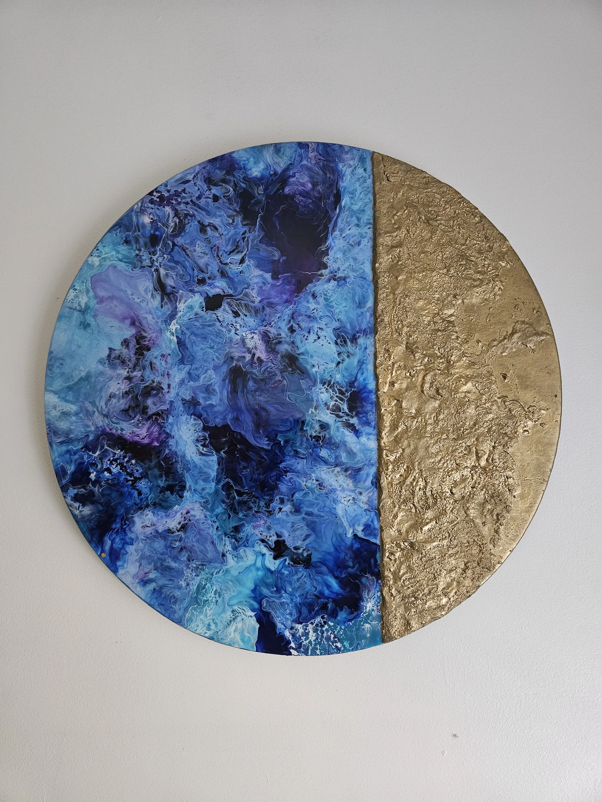Presenting a unique abstract fluid art creation named "Mermaid Moon." Crafted with a captivating combination of blue, white, purple, and gold acrylic paints, this artwork is skillfully coated with epoxy resin on a wooden surface, providing both durability and a stunning finish. The addition of molding paste lends an enticing texture to the piece. Sized at 24 inches, "Mermaid Moon" is a one-of-a-kind artwork that serves as a sister piece to "Intrinsic," which is also available on this site. The painting beautifully interprets planets within galaxies, offering an intriguing glimpse into the abstract realm.
